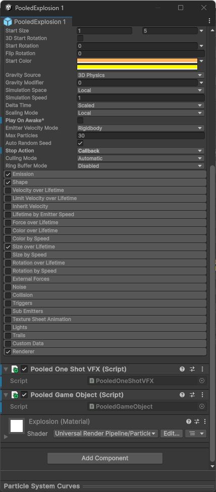 The idea of the component is that when it’s spawned, it starts playing the attached ParticleSystem, it then listens for the message that the ParticleSystem has finished and returns it back to the pool.